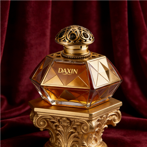 Botol parfum kaca segi ini, yang dihiasi dengan lapisan geometris emas dan tutup filigran yang rumit, memancarkan kemewahan kerajaan. Cairan berwarna kuning keemasan yang kaya di dalamnya memperkuat daya tariknya yang mewah dan agung untuk lini wewangian kelas atas.